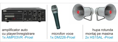 Sistemul este compus dintr-un amplificator, difuzoare (2 bucati) si un microfon de mana.